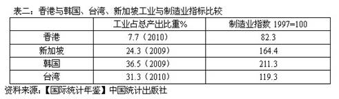 在上世纪70年代,制造业占香港总产出的比重曾高达30%,直到80年代中期仍高于20%,但是到新世纪初已下降到5%,2010年已不足1.7%。从工业占总产出的比重看,目前香港已经减少到只有其他“三小”的1/4-1/5。因此制造业这个高附加值产业的长期持续衰退,显然是香港经济增长能力长期下滑的重要原因。