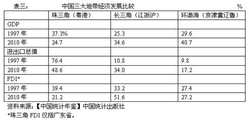 表三说明,90年代后期以来,中国经济增长极向北移动,特别是向长三角地区移动的趋势是极为明显的。珠三角地区在中国东部沿海发达地区经济比重的显著下降,当然主要是因为香港是发达经济体,因此经济增长速度缓慢,就广东省本身看,GDP占三大地带的比重还是上升的,从1997年的13.7%上升到2010年的18.6%,但是贸易的比重还是从1997年的49.2%下降到2010年的32.4%,外商直接投资的比重也从1997年的39.%,下降到2010年的21%。特别需要指出的是,尽管广东省的GDP总值目前还是全国第一,人均GDP却早已被江苏与浙江超过,中国重工业最发达的辽宁省,2011年的人均GDP也已经追上了广东。从工业总产值看,2010年广东是8.6万亿元,而江苏是9.2万亿元,因此从工业规模看,广东已经被江苏超过。由于重工业是高附加值的资本与技术密集型产业,而轻工业是低附加值的劳动密集型产业,因此重工业比重高的地区,其人均附加值也会高于轻工业比重高的地区。2011年江苏省的重工业比重是73.4%,,而广东当年是61.5%,因此江苏的人均工业产值就比广东高出了46%,最终反映为2011年江苏的人均GDP比广东高出了22.6%。而广东在全国工业中的地位下降,对香港服务业的发展就具有长期影响。