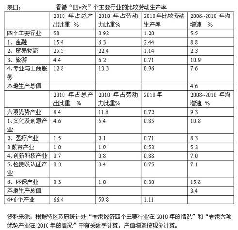 表四数据说明,所谓“六项优势产业”,没有一个产业的比较劳动生产率大于“1”,也没有一个产业的比较优势能高过金融和贸易物流这两个产业,“四个主要产业”中的旅游和专业与工商服务这两个产业的比较劳动成产率也低于“1”,也无法与金融和贸易物流相比。而金融和贸易物流不仅比较劳动生产率显著高出其他服务业,并且规模大,占了香港全部产出的41%和十大服务业的62%,这种情况说明,尽管金融和贸易物流以外的其他服务业的增长势头近年来还不错,但这八大服务业中的哪一个,在未来很长的时间内都难以替代金融和贸易物流这两大服务业的地位。