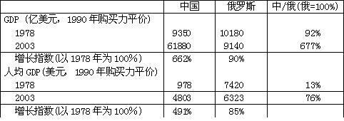 该表显示,以购买力平价衡量,在1978-2003年期间,中国经济规模成长为原来的6.6倍,人均GDP是过去的近5倍,而俄罗斯经济则萎缩到原来的90%,人均GDP萎缩到原来的85%。1978年中国经济总量小于俄罗斯,而2003年则相当于俄罗斯的6倍多。1978年中国的人均GDP仅仅相当于俄罗斯的13%,而2003年则达到后者的76%。中国与俄罗斯之间还有一定的距离,但差距已经大大缩小。