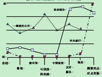 第二步是画出战略布局图,针对上述选定的竞争要素,调查主要竞争对手的状况,然后画出战略布局图。见图1和图2。