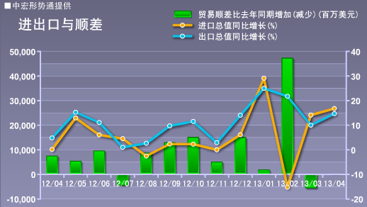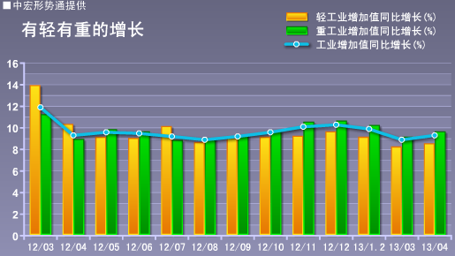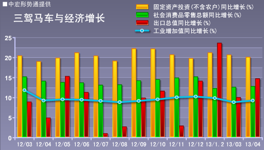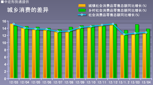 从5月来看,随着黄金价格的反弹,“抢金潮”逐步退散,预计黄金销售将出现回落,拖累消费的进一步增长;同时,食品安全问题所引发的相关消费增速回落在短期内还将持续。短期将影响消费增长。总的来看,当前消费缺乏新的增长点,从4月的“抢金潮”可以看出我国金融改革的严重滞后,居民缺乏投资渠道,因此才会出现“中国大妈”对战华尔街的现象。不过今年以来的财政支出一直偏向民生,同时国务院多次强调简政放权,激活小微企业的活力,这将有利于推动中长期消费增长加速。如果各方面改革加快推进,城镇化能有效启动,后期消费仍将稳步增长。