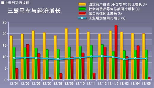 5月份,经济运行总体保持相对平稳,但波动中显疲态。从拉动经济增长的“三驾马车”来看,投资增长连续三个月小幅下滑;出口在挤出水分之后增速大幅回落,同比仅增长1%;消费增长继续小幅回升,但相对于去年来说,消费增长仍然较为疲弱。工业产出增长本月小幅回落0.1个百分点,反映出在需求低迷的情况下,产出增长的不稳。PPI已经持续了一年多的负增长,反映出一面是严重过剩的产能,另一面是疲弱的外需以及未能打开的内需。目前这场金融危机还远未过去,全球经济短期内也无法走出低迷,外需的疲软将成为一个中长期趋势,扩内需是必然的战略选择。但目前制约我们的是上一轮改革所开启的市场红利已近衰减殆尽,而新一轮改革在各种阻力重压之下难以推进。政治体制改革未能启动,经济体制改革尚未到位。我们必须摒弃速度崇拜,但更为重要的是必须拿出更大的勇气和决心切实推进改革。与此同时,我们也必须关注短期经济形势的稳定,政策微调避免经济增速过快下降。