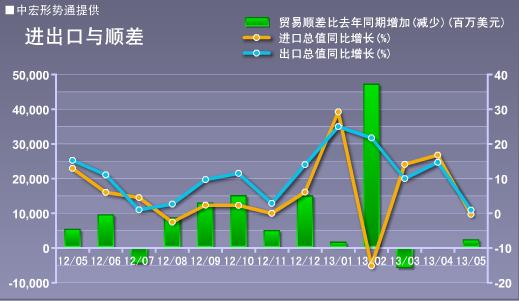 5月份,我国进出口总值3451.1亿美元,增长0.4%,增速下滑15.3个百分点。其中出口1827.7亿美元,增长1%,较上月大幅下降13.7个百分点;进口1623.4亿美元,下降0.3%,增速下降17.1个百分点;贸易顺差204.3亿美元。在国家加强对港套利贸易的监管下,进出口增长的水分被挤出,5月份对港出口增速大幅下降49个百分点至7.7%。不过5月份进出口增速大幅回落至接近零增长,仍然使人担忧,而6月4日,欧盟委员会宣布,将从6月6日起对产自中国的光伏产品征收临时反倾销税,前两个月的税率为11.8%。欧盟作为中国第二大出口市场,中欧之间的贸易爆发贸易争端使得外贸形势更是雪上加霜。