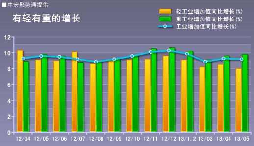 5月份,规模以上工业增加值同比实际增长9.2%,比4月份回落0.1个百分点。从环比看,5月份,规模以上工业增加值比上月增长0.62%。分轻重工业看,5月份,重工业增加值同比增长9.8%,较上月上升0.2个百分点;轻工业增长8.0%,较上月回落0.5个百分点。