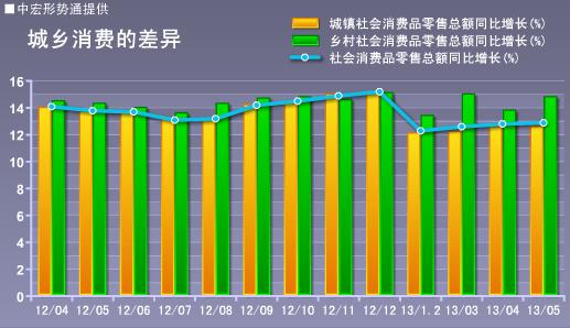 5月份,社会消费品零售总额同比名义增长12.9%,较上月回升0.1个百分点,连续第三个月小幅回升。1-5月,国内社会消费品零售总额同比增长12.6%,比上年同期放缓1.9个百分点。具体来看乡村消费增长较快。5月份,乡村消费同比增长14.8%,分别比上年同期和上月加快0.5和1.0个百分点,比城镇消费增速高2.2个百分点。此外食品、服装、家电、通讯器材销售稳中回升,金银珠宝、汽车、家具等销售增速放缓,餐饮消费缓慢回升。