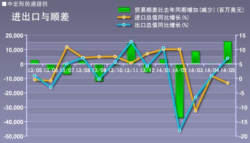 主要贸易伙伴方面,欧盟、美国、东盟对出口增速贡献较大。5月,对欧盟出口同比增长13.4%,虽较上月下降1.72个百分点,但仍保持两位数的增速水平,是拉动中国出口的主力;对美国出口同比增长6.3%;对东盟出口同比增长9.14%,较4月上了5.39个百分点。汇率方面,外管局公布的数据显示,5月份,人民币月均汇率较4月贬值了0.1%,贬值幅度较4月份明显趋缓,但仍利好出口。5月,机电及高技术产品出口增速上升明显,这主要受基数因素影响。高技术产品附加值较高,因而热钱极易借助其出口流入境内,去年5月的高压打击热钱行动导致当月出口增速大降,这就形成了今年出口的较低对比基数。但是,5月高技术产品环比增速4.35%,增速偏高,对东盟出口增速回升也十分明显,同时欧洲等大经济体量化宽松政策呼之欲出,可能的热钱涌入须引起关注。