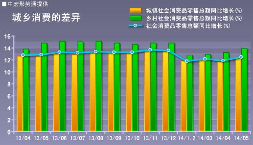 具体来看,5月份,城镇消费品零售额18401亿元,同比增长12.3%,增速较上月提高0.6个百分点;乡村消费品零售额2849亿元,增长13.9%,提高0.7个百分点,城乡消费增速同步提高。国家统计局公布的数据显示,2013年末,全国城镇常住人口约为7.3亿,乡村常住人口6.3亿。粗略计算,城镇人口平均月消费2520元,乡村人口平均月消费452元,城镇消费水平约为乡村人均消费水平的5.6倍。