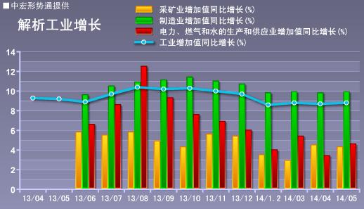 2014年5月,工业形势基本平稳。规模以上工业增加值同比实际增长8.8%,比4月份加快 0.1个百分点,比去年同期下降0.4个百分点。从环比看,5月规上工业增加值比上月增长0.71%,环比增速回落0.11个百分点。