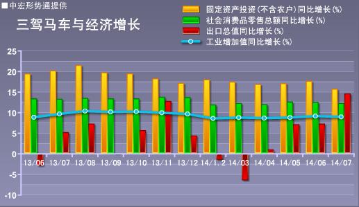 7月份,经济增长未能延续二季度的好转态势,多项经济数据环比回落,让看似企稳的经济再添变数。从三驾马车来看,出口是本月的最大亮点,7月同比增长14.5%,较上月大幅回升7.3个百分点,但存在虚高的成分;投资在连续回升两个月后再次出现回落,单月增速创下近年来的新低,反映出前期“微刺激”政策的效应在减弱;消费相对来说较为平稳,但近两月也呈现出小幅回落的态势,依靠消费来支撑经济增长难以实现。终端需求不足、叠加产能过剩等影响,工业生产也停止了其好转的趋势,再次出现回落。