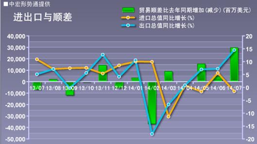 7月,我国外贸形势总体表现稳中有升,当月进出口总值3784.81亿美元,同比增长6.9%,较上月回升0.5个百分点。但进、出口走势却出现明显分化,其中出口2128.91亿美元,同比增长14.5%,较上月大幅回升7.3个百分点,是去年5月以来的新高;进口1655.91亿美元,同比增长-1.6%,增速较上月回落7.1个百分点。进、出口增速的明显分化使得贸易顺差创下历史新高,当月实现473亿美元。