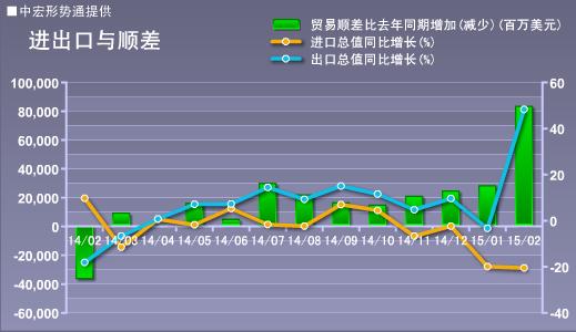 2015年1-2月份,我国进出口总值6181.7亿美元,同比增长-2.3%,较去年全年下滑5.7个百分点。其中出口总值3694.1亿美元,同比增长15%,较去年上升8.9个百分点;进口总值2487.6亿美元,同比增长-20.2%,较去年大幅下滑20.6个百分点。