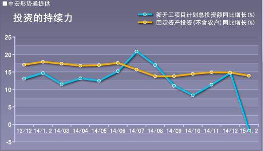 2015年1-2月份,全国固定资产投资(不含农户)34477亿元,同比名义增长13.9%,较去年全年下滑1.8个百分点。累计增速创2001年以来新低。从环比看,2月份固定资产投资(不含农户)增长1.03%,为去年10月份以来的新低。