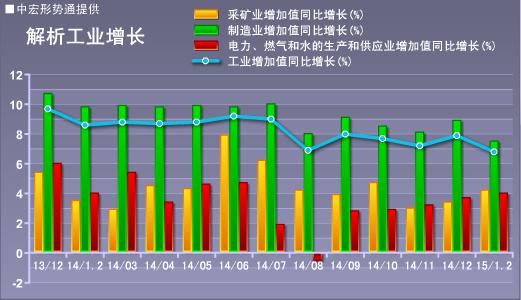 2015年1-2月份,规模以上工业增加值同比实际增长6.8%,较2014年12月份回落1.1个百分点,增速创2009年3月以来的新低。从三大门类来看,主要是受制造业下滑1.4个百分点影响。