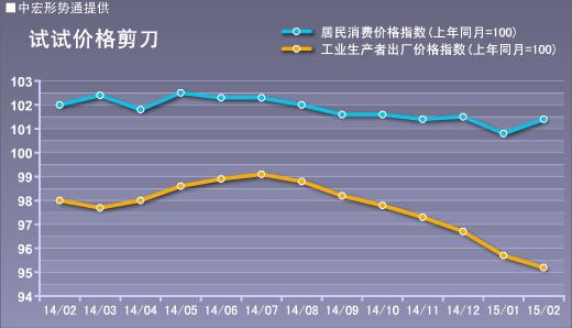 2015年2月份,全国居民消费价格总水平同比上涨1.4%,涨幅较上月提高0.6个百分点,较去年同期下降0.6个百分点。从前两月累计来看,CPI同比上涨1.1%,较去年同期下降1.1个百分点。值得注意的是,1月份陕西CPI同比下降0.1%,这是2010年2月以来首次有省份CPI出现负增长。