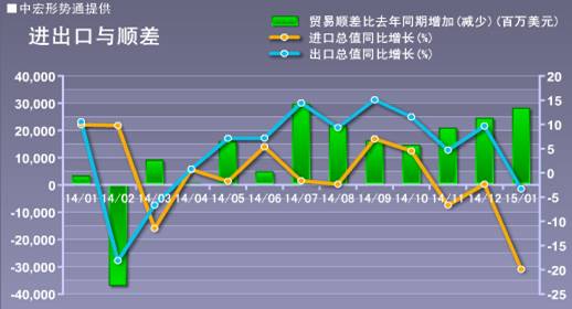 上述因素在2015年初仍将持续,需求大幅回暖的契机仍未出现,供给稳定增长态势不变,价格持续下跌在预期之中。美国页岩气和页岩油的快速发展导致美国天然气和原油产量快速增长,而主要石油输出国沙特宣布不减产也将保持石油供给相对充足,再考虑到全球需求疲软,2015年石油价格仍将保持下降态势。考虑到大宗商品价格之间存在联动效应,即原油价格的不断下跌能够一定程度上带动全球煤炭、天然气等能源产品价格回落,因此,预计今年国际大宗商品价格仍将延续去年同步下滑的趋势,再创新低,铁矿砂等商品情况亦然。受此影响,预计一季度在需求没有根本性扭转的情况下,进口增速难有提升。