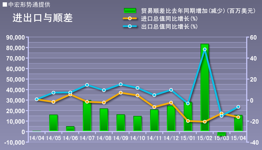 进口方面,4月份进口下降16.2%,较上月继续下降3.5个百分点。大宗商品价格持续低迷与内生性经济增长动力不足使进口大幅塌陷,虽然油价或在二季度有所回暖,但在全球需求不足的大环境下,价格回升动力明显不足,二季度仍将继续制约进口增速回归。