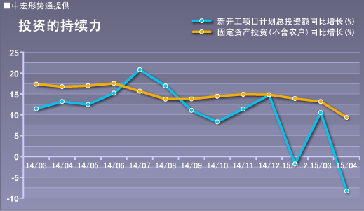 随着上一轮大规模投资的陆续完成,投资效果已经逐渐释放殆尽,新一轮投资需求启动尚需时日。反映未来投资需求的新开工项目计划总投资增速,在进入2015年以后大幅跌落是最明显的佐证。目前投资需求不足,预计未来几个月投资增速仍将继续下滑。