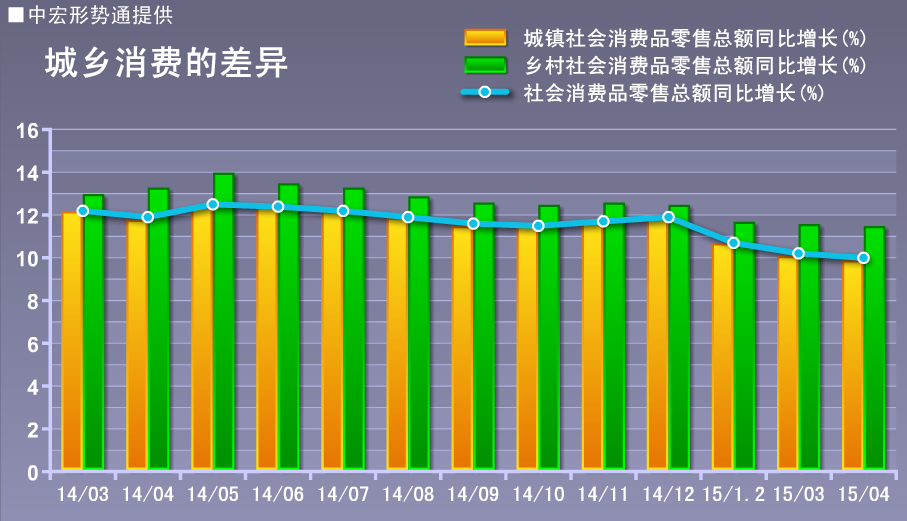 消费持续放缓是多重因素叠加所致,一是经济下行、居民收入乏力传导至消费领域;二是股票市场升温,居民缩减了短期消费,集中资金投入股市,属于刚性需求的日用品消费较上月大幅下滑3.8个百分点;三是房地产深度调整趋势继续限制了相关产品消费,家具和建筑装潢材料结束上月短暂反弹后小幅回落;四是大力度反腐令政府消费继续承压。此外,近期人民币实际有效汇率不断升值也助推了境外消费旺盛,继续分流国内购买力。综合以上因素,除非本轮房地产销售向好趋势持续,带动相关消费明显上涨,否则中短期内消费将持续低迷。