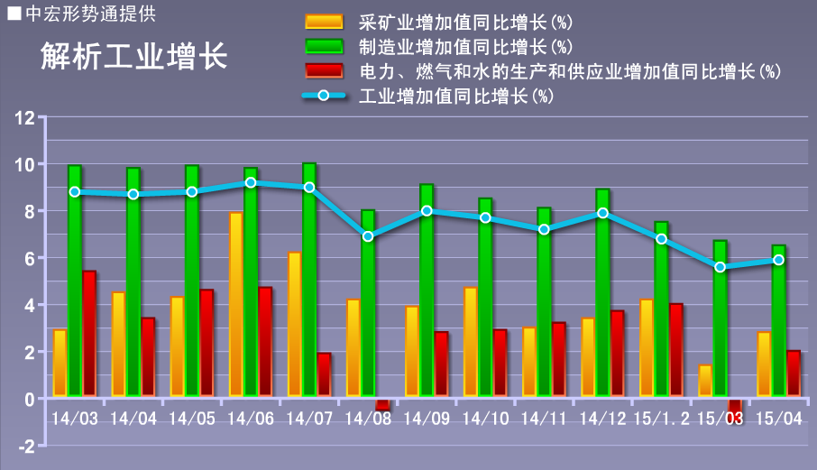 工业三大门类走势分化,采矿业、电力生产业增速低位回升,拉升工业增速;制造业增速连续4个月下滑,幅度有所减小。
