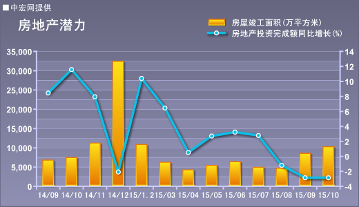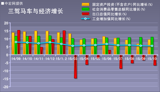 10月,工业增加值增速同比增长5.6%,较9月下降0.1个百分点,同时,预示实体部门将继续收缩的进口增速仅为18.8%,经济形势严峻。三驾马车中,出口同比下降6.9%,降幅继续扩大,特别是历史同期均为出口高峰的情况下,显示外需寒冷依旧,投资降至10.2%,离个位数增长仅一步之遥,虽然新开工项目是10月亮点,但以基建为主的项目可持续性堪忧,而房地产库存增速上升出乎市场意料,预示未来房地产投资难以跟上,消费虽弱但继续保持稳定增长态势。