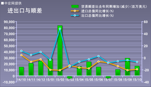价格方面,CPI同比增长1.3%,较9月下降0.3个百分点,环比跌幅也有0.3%。内外需不足导致的工业原材料及产出品价格下跌的影响仍然持续,大宗商品价格处于历史低位。同时,全球粮食丰收推动的粮价下跌已成定局,食品价格恐难再支撑CPI增速稳定在1.5%的水平,去除双节因素,CPI明年上半年跌入负增长也并非遥不可及。 实体经济持续收缩、物价水平逐步回落,加之资本市场延续二季度以来的动荡态势,中国经济通缩压力进一步加大。 出口增长前景灰暗 进口陷入量价齐跌