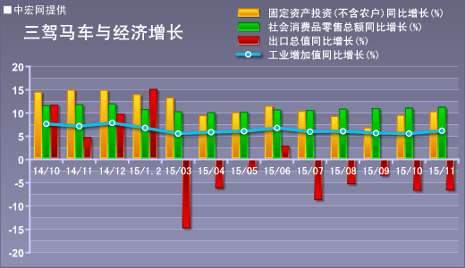11月,在稳增长政策的持续努力下,经济短期企稳回升,这有助于完成今年经济增长目标。但三驾马车中,出口仍处于历史低位,投资增长乏力,消费慢变量不改,经济企稳基础不牢。物价方面,受丰产推动,粮食和肉类环比仍下行,CPI上升动力不足,年底价格水平仍保持低位运行。国际油价不断创历史新低,大宗商品价格拖累PPI持续低迷,通缩压力并未得到缓解。为应对2016年可预见的严峻形势,各方面政策应早做打算,防止经济出现硬着陆风险。短期来看,人民币贬值稳定出口是首要任务,而且贬值速度要快幅度要深,其次,基建投资短期是稳增长的主引擎之一,同时,长期来看,城市化依然是中国经济走出低谷的唯一道路,收入分配改革速度必须加快。 实体经济企稳回升 通缩压力并未缓解