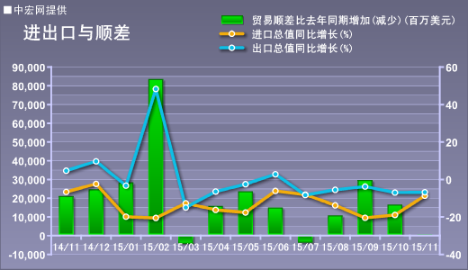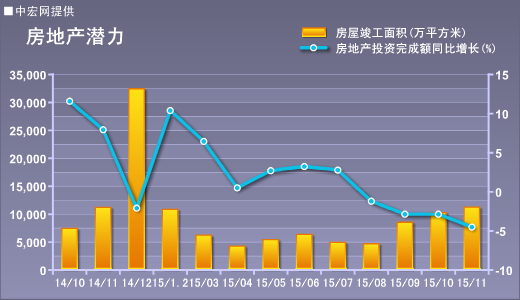 出口方面,11月出口增速同比下降6.8%,较上月收窄了0.1个百分点,创历史同期最低水平。分国别来看,对美国出口同比下降5.3%,降幅较上月扩大4.41个百分点,对欧盟同比下降9%,降幅较上月扩大6个百分点,对东盟出口同比下降2.5%,降幅较上月收窄8.4个百分点。 历来的双节因素在今年并未能带动出口回温,发达国家经济持续低迷已经严重打击了其消费能力,美国受打击的中产阶级、欧洲高企的失业率与土俄地缘政治风险都预示了今年不再是一个美好的圣诞节。另外,对东盟出口降幅大幅收窄也主要是受基数因素影响。近期,新兴市场不稳定因素骤增,巴西和南非政治环境动荡,谁是下一个倒下的新兴市场国家已经成为热门话题,东盟经济虽然基本保持稳定,但其一直未能缓解的金融风险仍不容忽视。 进口方面,11月进口增速同比下降8.7%,降幅较上月大幅收窄10.1个百分点,但仍然处于历史同期次低位。进口的回暖有一定的基数因素,从季调后的数据来看,11月进口同比下降12.3%,降幅仅较上月收窄了2.7个百分点。另外,铁矿石进口额的大幅回升也是一方面因素,国内正加快基建投资项目上马,同时,铁矿石价格今年暴跌45%迫使国内大量高成本铁矿厂倒闭,部分国内需求只能转而依赖进口。 近期,国内稳增长政策效果渐显,基建项目对进口的带动也日益扩大,但钢铁产能过剩情况并未得到缓解,铁矿石库存量依然持续偏高,基建投资带动的大宗商品进口量增长不具备长期可持续性,未来进口低迷态势难改,加之外部环境恶劣,出口形势极不明朗,人民币贬值幅度尚不足,2016年外贸情况依旧严峻。 新上项目保驾护航 楼市分化日趋严重