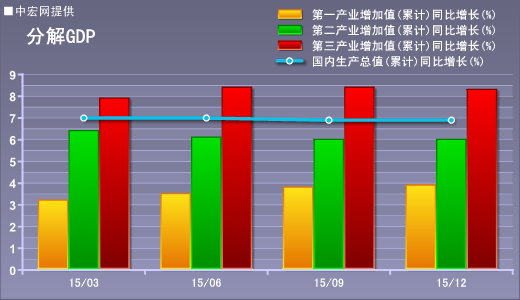全年国内生产总值676708亿元,按可比价格计算,比上年增长6.9%。分季度看,一季度同比增长7.0%,二季度增长7.0%,三季度增长6.9%,四季度增长6.8%。分产业看,第一产业增加值60863亿元,比上年增长3.9%;第二产业增加值274278亿元,增长6.0%;第三产业增加值341567亿元,增长8.3%。 2015年,第三产业是拉动经济增长的主要动力,第二产业增长明显疲弱,经济结构出现较大变动,全球需求不足拖累下的产能过剩继续困扰中国经济。2016年,外部环境不确定性依然较强,发达经济体难以走出债务阴霾,新兴市场风险已经由外向内深化,中国持续了三十年的经济发展模式正经历由外向型向内生型艰难调整期,改革进入深水区,保持经济平稳增长的难度前所未有。