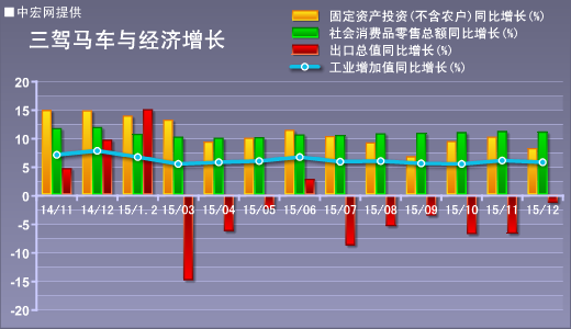 从三驾马车的情况来看,2015年,全球需求严重不足,出口增速跌至谷低,导致国内过剩产能难以疏解,新开工项目陷入低迷,投资需求增长乏力,进口持续萎缩,大宗商品价格腰斩,而收入分配改革迟滞也抑制了消费增速的提升,慢变量态势延续整年。