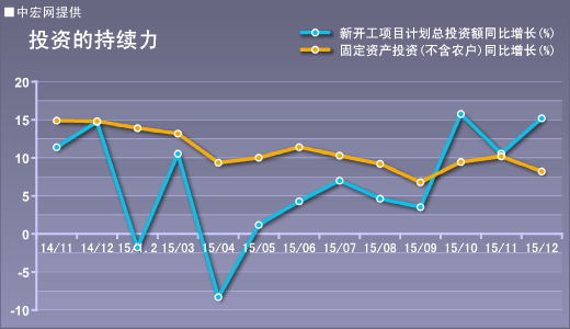 2015年,固定资产投资同比增长8.7%,较去年下降5.7个百分点,其中,中央项目固定资产投资同比增长6.2%,较去年下降4.4个百分点,地方项目同比增长10.2%,较去年下降5.7个百分点。地方项目投资疲弱是投资增速整体下降的主要原因。在怠政等因素影响下,中央引导性投资未能起到良好作用,地方投资未能跟上。 从行业的情况来看,受大宗商品需求持续低迷影响,采矿业投资大幅下降,全年萎缩8.8%,制造业投资增长8.1%,较去年下降了5.4个百分点,产能过剩基本席卷了整个制造业,除汽车制造业上升了5.9个百分点外,其它行业均呈现下滑态势,铁路、船舶、航空航天和其他运输设备制造业下滑幅度超过13个百分点。与基建投资相关的交通运输与水利投资仍然保持了较高的水平,是2015年支撑投资增长的主要原因。另外,卫生和社会工作投资增速高达29.7%,较上年上升了2.1个百分点,投资向民生领域倾斜显示明显效果。 另外,施工项目计划总投资增速增长4.3%,较去年下降了6.8个百分点,同时,新开工项目计划总投资增长5.5%,较去年下降了8.1个百分点,新项目上马速度偏弱显示2016年投资完成额或将继续增长乏力。