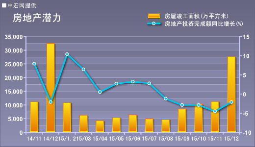 2015年,房地产开发投资增长1%,较去年下降了9.5个百分点,房地产投资低迷持续了全年,到四季度才显现企稳态势。 从需求的情况来看,商品房销售面积增长6.5%,销售额增长14.4%,均保持了相对较高的水平,同时,待售面积增长15.6%,较去年底大幅下降了10.5个百分点,房地产去库存效果显现,不过,由于库存布局较为不均衡,三四线城市较高,而一线城市极低,但一线城市土地供应紧张,争夺激烈,房企新上项目投资增长依然乏力。 具体到供给方面,房屋施工面积同比增长1.3%,较去年下降了7.9个百分点,显示2016年投资完成额或将继续低迷,同时,新屋开工面积同比下降14%,房地产投资需求大幅萎缩,土地购置面积同比下降31.7%,土地成交价格同比下降23.9%,受此影响,地方财政收支入不敷出。